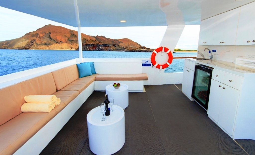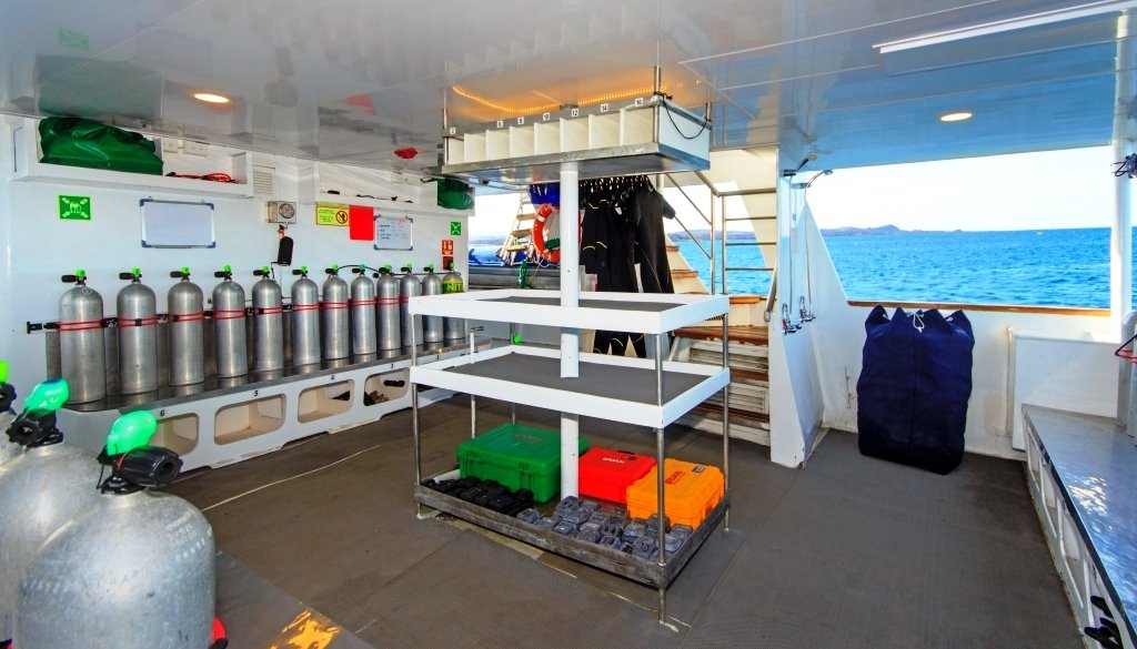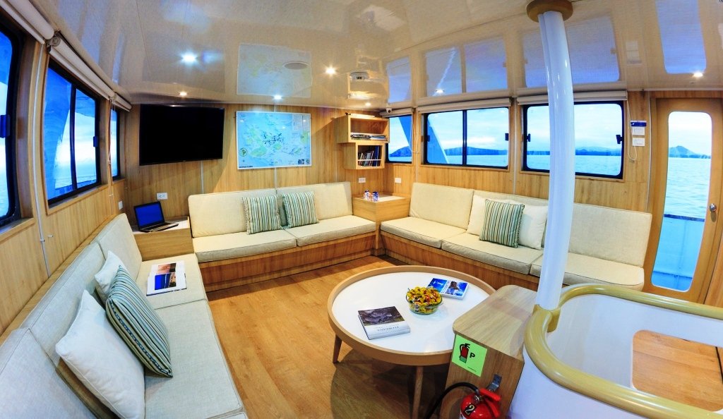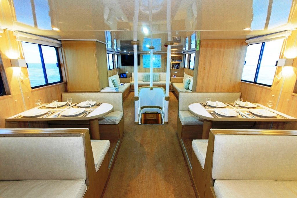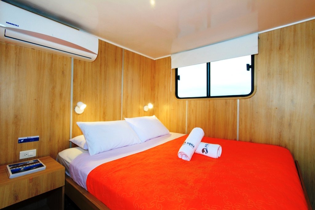 The Aqua has 9 cabins, spread across the lower, main, and upper decks. It also features a lounge, a dining room, a spacious dive platform, and a beautiful outdoor bar. During the diving cruises, equipment can be rented at a reasonable price.