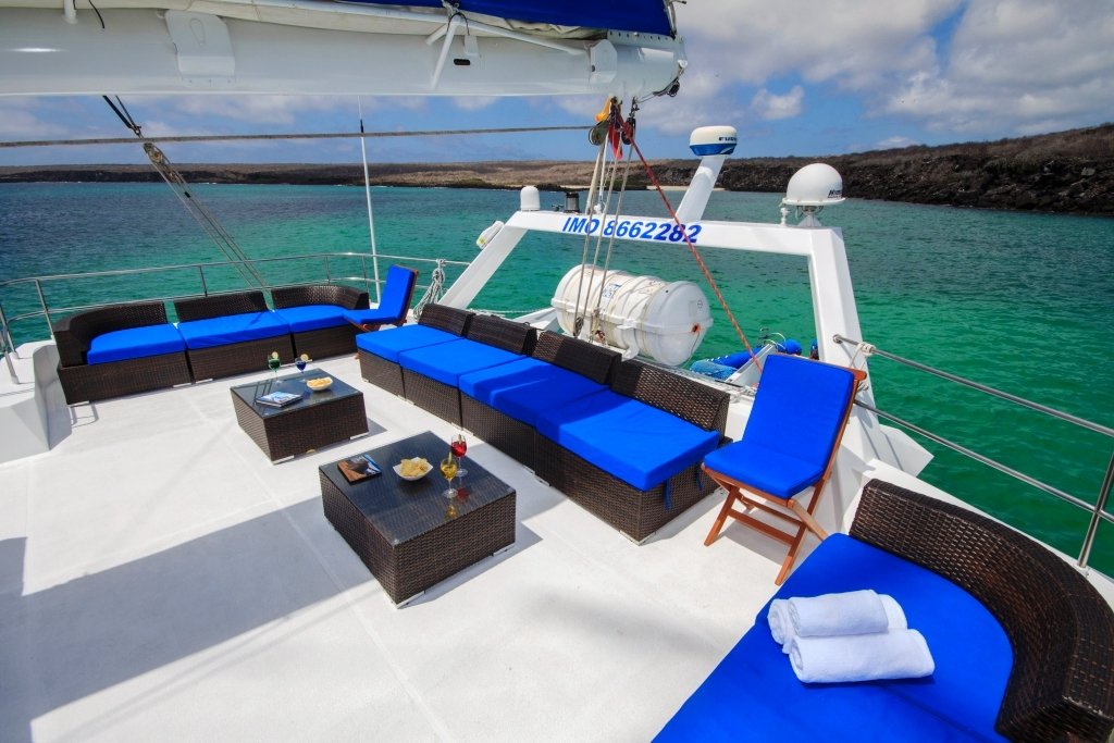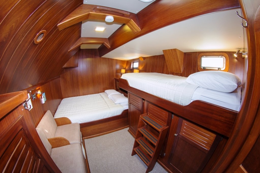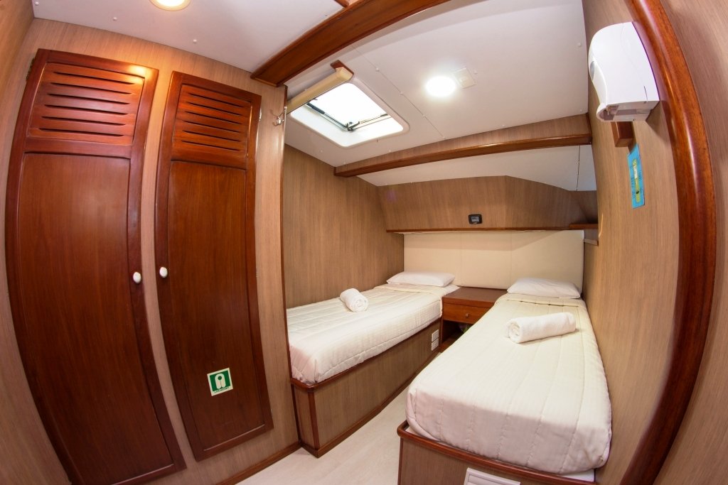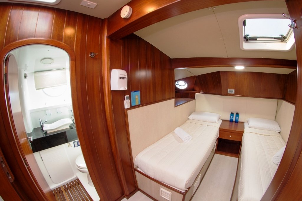 This beautiful sailing catamaran for 16 people has 3 single cabins, 2 cabins with a matrimonial bed and 3 cabins with a low double bed and a high single bed. All cabins have a private bathroom and air conditioning. From the cabins you have beautiful views of the islands. The sun deck is a great place to hang out. Here you can relax in the jacuzzi. On board you can also use the snorkeling equipment and two kayaks.