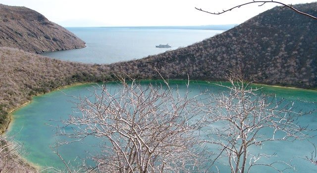 This is an inlet on the east side of the island, where whalers and pirates docked. There is a path (1800 mt) up to a small crater with a salt lake. The path leads to the top from where you can see the other side of the island. In clear weather you have an impressive view of Wolf, Darwin, Alcedo, Sierra Negra and Cerro Azul. A pagan trip along the coast is also recommended here. You will often find whales in the sea channel between Isabela and Fernandina. You often sail between schools of dolphins and the whales’ spray fountains often come close to the ship.